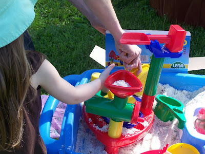 The Sand Play Castle ($22.98) from Magic Cabin Toys is comprised of twenty-two large pieces that stack and connect to form wonderful structures reminiscent of Rube Goldberg machines (you know, the mouse pedals a bicycle and makes the spaghetti boil which makes a bird jump which makes a whistle toot... and so on..) The sieves, funnels, wheels, strainers and levers move sand (or water) from top to bottom and actually fulfilled the promise of hours of outdoor entertainment. Not just for the two and four year old little girls, but also for their big brothers and dad. I played a bit as well.